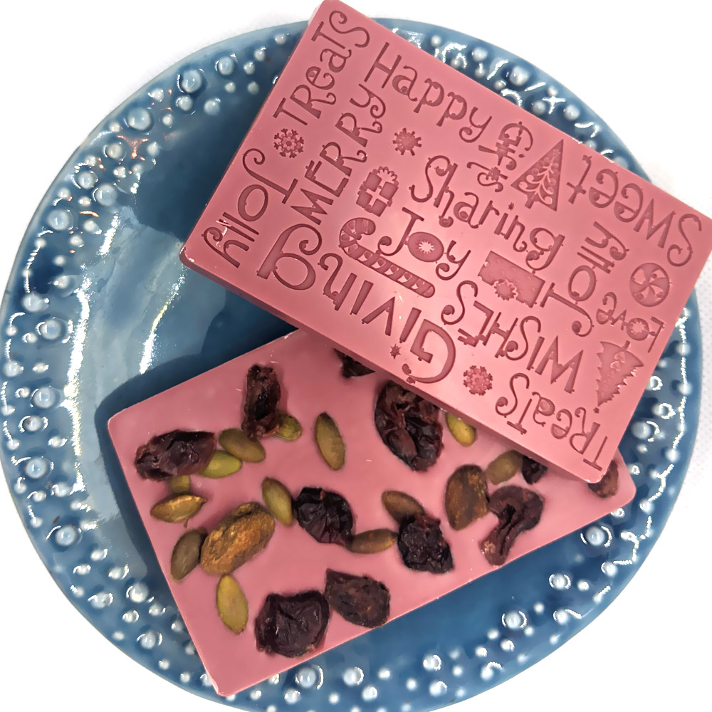 Ruby chocolate bar with cranberries, sunflower seeds, and pepitas